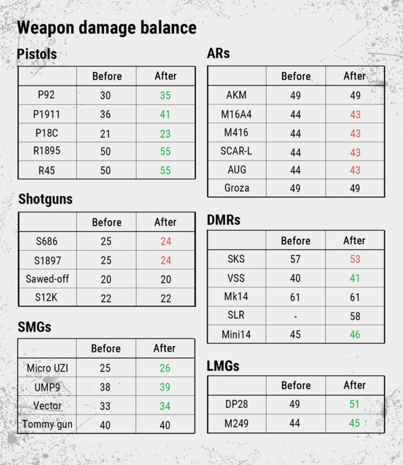 Dieses bringt vor allem das angekündigte, überarbeitete Waffenbalancing mit sich. Das Ziel der Entwickler: Die Spieler sollen während ihres Überlebenskampfes verstärkt andere Waffen einsetzen. Denn aktuell kommen vor allem die Sturmgewehre M4, SCAR und die Kalaschnikow zum Einsatz, während die restlichen Waffen nur selten eingesetzt werden oder schlichtweg nur dann, wenn noch keines der Sturmgewehre gefunden wurde.